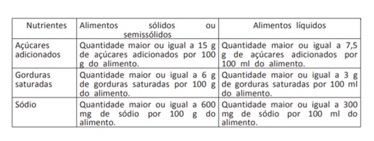 Esta tabela contém os limites de açúcares adicionados, gorduras saturadas e sódio para fins de declaração da rotulagem nutricional frontal: