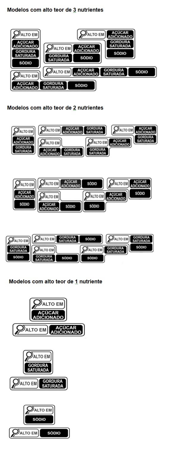 A declaração da rotulagem nutricional frontal deve ser realizada empregando a impressão em cor 100% preta num fundo branco, conforme modelos abaixo: