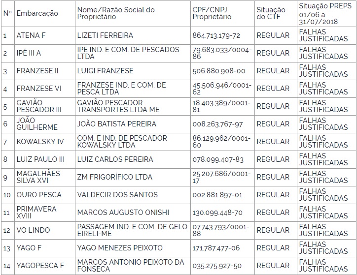 A SAP divulgou a relação dos barcos que têm pendências junto à Secretaria da Pesca e na Justiça Federal. “Essas 18 embarcações têm prazo de três dias úteis para apresentarem recurso quanto às pendências apresentadas, conforme prevê a legislação”, falou Seif Jr.