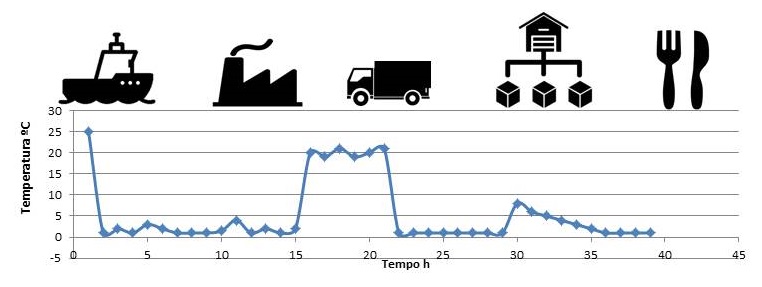 Para efetuar esta tarefa, o emprego de tecnologia é bem vindo, mas é possível fazê-la no papel ou em planilhas do tipo Excel. O importante é compreender o conceito por trás da ferramenta (através da capacitação ou contratação de um especialista). Por exemplo, o Codex Alimentarius e a NBR ISO 22000 consideram a temperatura de armazenagem do pescado um Ponto Crítico de Controle (PCC), portanto é um tipo de informação essencial, sendo a qualidade e a sanidade do pescado, funções da temperatura. Vamos usar a temperatura de um lote como exemplo da aplicação desta ferramenta. Na Figura 1, temos o exemplo de quebra de cadeia de frio.