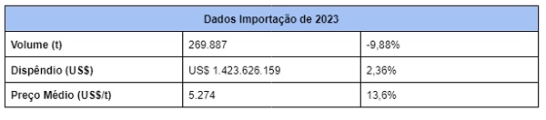 As importações também sofreram alterações importantes. O Brasil importou 270 mil toneladas de pescado ao longo de 2023, foram exatos 269.887 toneladas, uma redução de 9,88% no volume quando comparado com 2022.