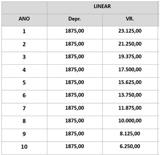 Tomando-se como exemplo um bem adquirido no valor de R$ 25.000,00, com uma taxa residual de 25% em relação ao valor de aquisição para uma vida útil de 10 anos, tem-se uma depreciação anual constante de R$ 1.875,00. Ao final do 10º ano, obtém-se um valor residual de R$ 6.250,00 (o que em prática reflete os 25% do valor do bem inicial):