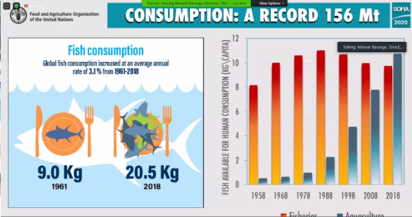 O consumo per capita de pescado cresceu de 9,0 kg (peso vivo equivalente) em 1961 a 20,5 kg em 2018, cerca de 1,5 % ao ano. Enquanto o consumo global de peixes em alimentos aumentou a taxa média anual em 3,1% de 1961 a 2017, é quase o dobro do mundo anual em crescimento populacional (1,6%) para o mesmo período e superior ao de todos os outros animais e alimentos protéicos (carne, laticínios, leite etc.), que aumentou 2,1% ao ano.