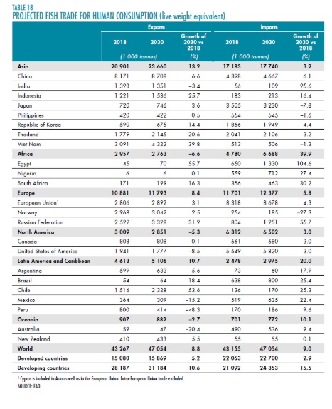 A produção total de peixes registrou importantes aumentos em todos os continentes no últimas décadas, exceto a Europa, conforme a FAO, com uma gradual diminuição registrada a partir do final dos anos 80, mas com recuperação ligeira nos últimos anos. Já nas Américas houve