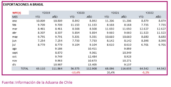 Em relação aos anos anteriores, os níveis de toneladas de 2019 a 2021 permaneceram constantes. Durante 2020, por conta da pandemia, houve um reajuste de preço para baixo, o que gerou uma recuperação nas exportações em 2021. Dado o comportamento de 2022, se pode pensar em uma exportação recorde em dólares para o final do ano no Brasil.