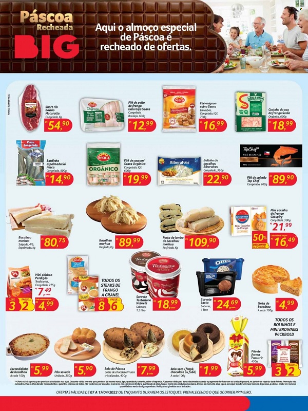 Para a Semana Santa deste ano, o Big colocou toda a sua linha de bacalhau com descontos que chegam até a 44%, como é o caso do kg do Bacalhau Morhua, a peça resfriada tem com aproximadamente 1,5kg. A rede também oferece o Bacalhau Ling Salgado 7/15, com aproximadamente 1kg, que custa R$ 62,99 o kg. E para quem prefere mais praticidade, os Bolinhos com Bacalhau Temperado da Riberalves, pacote com 12 unidades, também estão na promoção de R$ 22,90.