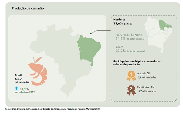 A carcinicultura é liderada pela Região Nordeste desde o início da série histórica da pesquisa, iniciada em 2013. Em 2020, o aumento foi de 14,1 % de sua produção, totalizando 62,9 mil toneladas de camarão, o que corresponde por 99,6% do total nacional.