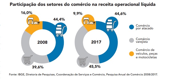 Em 2008, a participação do varejo na receita operacional líquida era de 39,6%, já no ano de 2017 subiu para 45,5%. Entre os grupos comerciais, os hipermercados e supermercados se destacam no aumento de participação na receita operacional líquida, passando de 9,8% para 12,5%, depois aparece o comércio varejista (2,2%), atacadista de produtos alimentícios (4,8%), bebidas (6,3%) e fumo (8,4%).