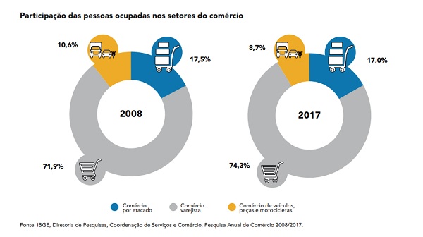 Conforme a publicação do Instituto Brasileiro de Geografia e Estatística (IBGE) que realiza, desde 1996, a Pesquisa Anual de Comércio (PAC), o número de pessoal empregado em atividades comerciais cresceu 29,9% entre 2008 e 2017, um salto de 7,9 milhões para 10,2 milhões de pessoas, deste total 74,3% estão no comércio varejista, 17,0% no comércio por atacado e 8,7% no comércio de veículos, peças e motocicletas.
