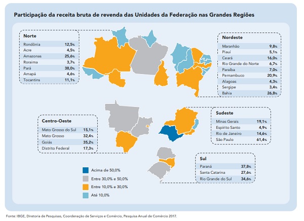 Na análise da distribuição percentual da receita bruta de revenda entre as Unidades da Federação dentro de cada grande região no ano de 2017, o Sudeste registrou maior concentração da atividade comercial em São Paulo, com 61,4% dessa variável na região. Minas Gerais ficou no segundo lugar, depois aparece o Rio de Janeiro e o Espírito Santo.
