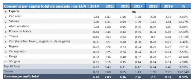 Em 2019, os consumidores dos EUA comeram 19,2 libras de frutos do mar per capita (equivalente a 8,7 kg) - um aumento de 0,090 kg em relação aos números revisados de 2018.
