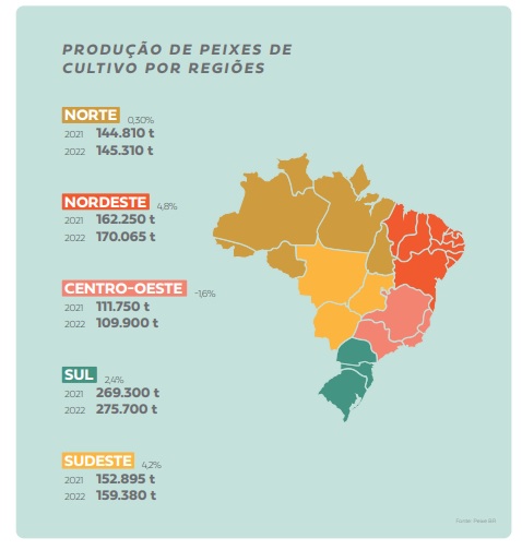 Com dois dos dez estados que mais produzem peixe no Brasil, a Região Sul continua a ser o principal polo de cultivo no País. As 275.700 toneladas registradas pelos sulistas em 2022 representam praticamente um terço (32%) de todo o volume nacional de peixe. E ainda teve crescimento de 2,4% sobre as 269.300 toneladas de 2021.