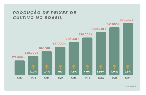 A PeixeBR informa que desde que oficializou essas estatísticas, em 2014, a evolução da produção de peixes de cultivo já chegou a 48,6%. É um acréscimo de 281.555 toneladas em nove anos.