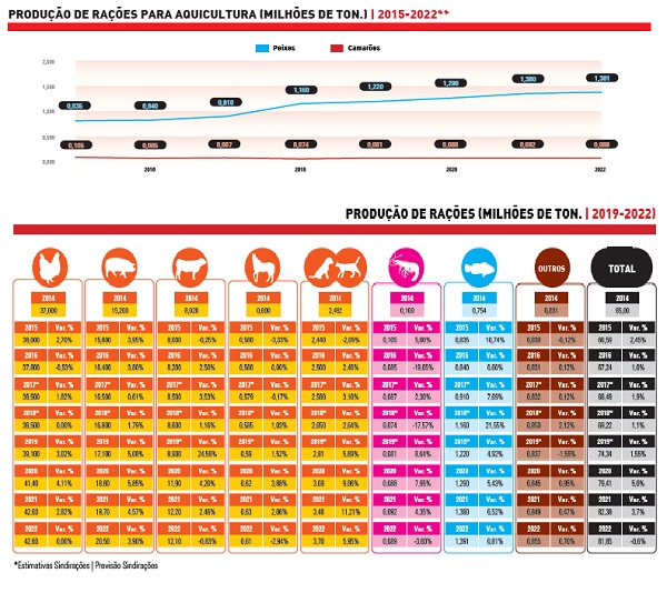 Diante de tamanha disparidade de dados, a Seafood Brasil continua a divulgar ambos os dados para que o leitor possa contrastá-los. No gráfico abaixo, produzido a partir de dados do Sindirações, acompanhamos o forte ritmo de expansão de rações para piscicultura, enquanto a nutrição para carcinicultura permanece estagnada.