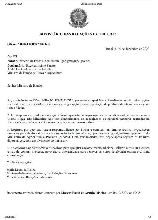 Em resposta ao MPA, Ofício nº 09041.000582/2023-17, de 04 de dezembro de 2023, do MRE, informava que "não há negociação em curso de acordo comercial com o Vietnã e que o MRE não tem conhecimento de negociações de natureza sanitária centradas na abertura de mercado para tilápias com aquele ou com outros países".