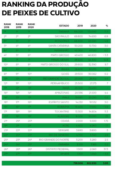No 4º lugar, a produção de Santa Catarina cresceu 3% e atingiu 51.700 toneladas. Já o aumento da produção de pangasius foi um importante ingrediente para o Maranhão ser o 5º maior produtor de peixes de cultivo em 2020, saltou 6% e totalizou 47.700 t.