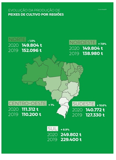 Na análise por regiões, o Sul continua liderando a produção e já representa 31,1% da piscicultura brasileira, com 30,3% em 2019 e produção de 249.802 t.