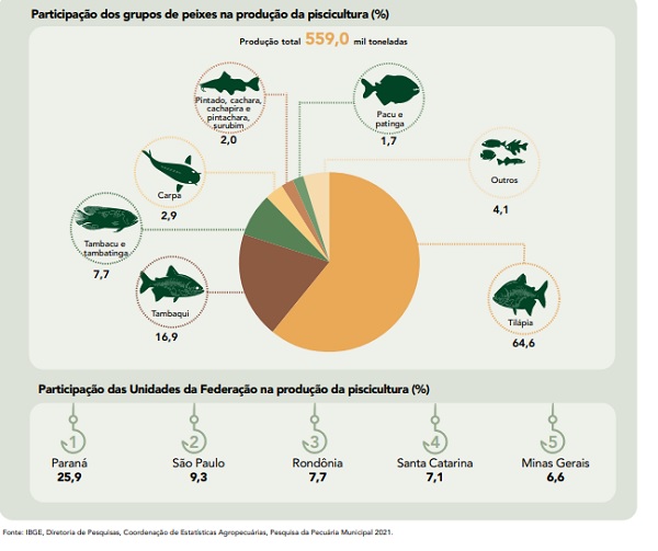 O Brasil produziu 559 mil toneladas de peixes em 2021, sendo 361,3 mil toneladas de tilápia. Isso significa que a espécie corresponde por 64,6% da produção total de peixes do País no ano passado, conforme dados do IBGE divulgados nesta quinta-feira (22).