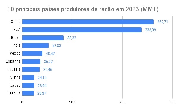 Juntos, esses dez países responderam por 63,1% da produção mundial de ração (igual a 2022). Quase metade da produção mundial de ração está concentrada em quatro países: China, EUA, Brasil e Índia.