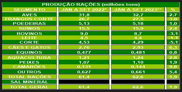 E, finalmente, incremento de 6,3% no caso dos cães e gatos. No geral, a previsão é finalizar o ano com produção aproximada de 87 milhões de toneladas de rações e sal mineral e apurar incremento de quase 1,5% em relação a 2022.