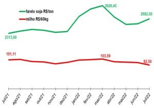 “A produção de rações, concentrados e sal mineral durante o primeiro semestre seguiu aquém daquela quantidade esperada, circunstância atribuída principalmente ao arrefecimento da demanda da cadeia produtiva de proteína animal (ovos e leite principalmente), bastante prejudicada por esse novo patamar de preço do milho, do farelo de soja e outros macro ingredientes da alimentação das poedeiras e vacas leiteiras, além da impossibilidade de repassar integralmente esse custo adicional, já que o preço pago ao produtor melhorou um pouco apenas mais recentemente”, diz.