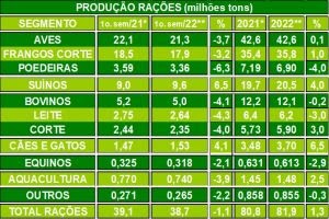 No geral, a prévia do setor de alimentação animal terá crescimento próximo a 1,5% até o final do ano. Os resultados apurados até agora revelam um ritmo mais conservador do que a previsão divulgada ainda no final de 2021, que apontava a produção de 88 milhões de toneladas de rações e suplementos minerais e expectativa de aumento na ordem de 3,5% neste ano corrente.