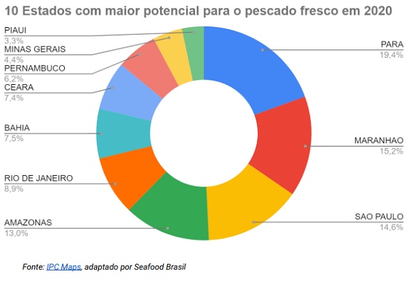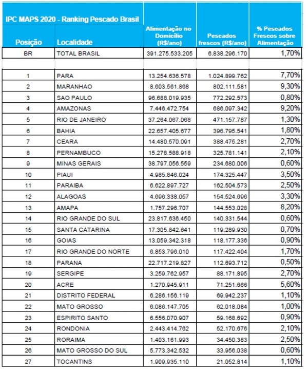 Segundo a versão mais recente do IPC Maps, os consumidores do Pará terão o maior gasto com pescado fresco do País - R$ 1 bilhão -, cifra que corresponde a 7,7% dos gastos totais com alimentação no Estado. Já o Maranhão, em segundo lugar nos gastos totais, terá a maior participação do pescado nos gastos com alimentação - 9,3%, seguido por Amazonas (9,2%) e Amapá (8,2%).