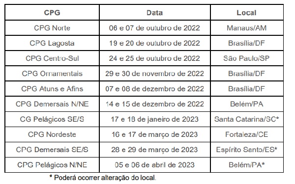 A Secretaria de Aquicultura e Pesca do Ministério da Agricultura, Pecuária e Abastecimento (SAP/Mapa) anunciou as datas previstas para as primeiras reuniões dos seus 10 Comitês Permanentes de Gestão da Pesca e do Uso Sustentável dos Recursos Pesqueiros (CPGs), da Rede Pesca Brasil (Rede Nacional Colaborativa para a Gestão Sustentável dos Recursos Pesqueiros) para o quadriênio de 2022 a 2026.