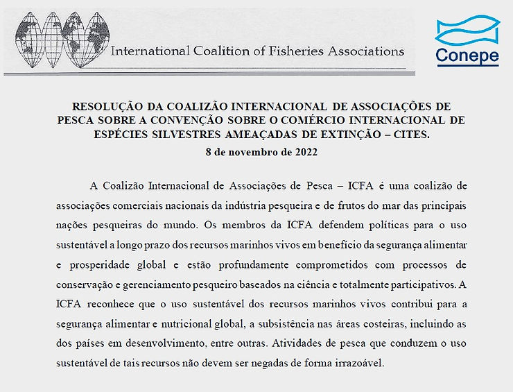 O Coletivo Nacional da Pesca e Aquicultura (Conepe), encaminhou para órgãos do governo federal e demais interessados a Resolução da Coalizão Internacional de Associações de Pesca (International Coalition of Fisheries Associations – ICFA) sobre a notificação da Convenção sobre o Comércio Internacional das Espécies Silvestres Ameaçadas de Extinção – CITES, nº 43/2022.