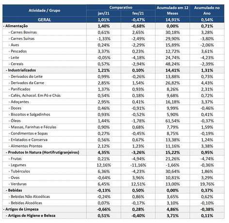 O setor supermercadista voltou a apresentar deflação nos preços após um ano de altas. A queda apontada pelo Índice de Preços dos Supermercados (IPS), calculado pela APAS/FIPE, foi de 0,5% em fevereiro. Segundo a Associação Paulista de Supermercados (APAS), o principal motivo foi a ausência do Carnaval e a espera do consumidor por novos auxílios, somados ao aumento de casos da Covid-19, que demandaram ajustes de preços em toda cadeia produtiva.