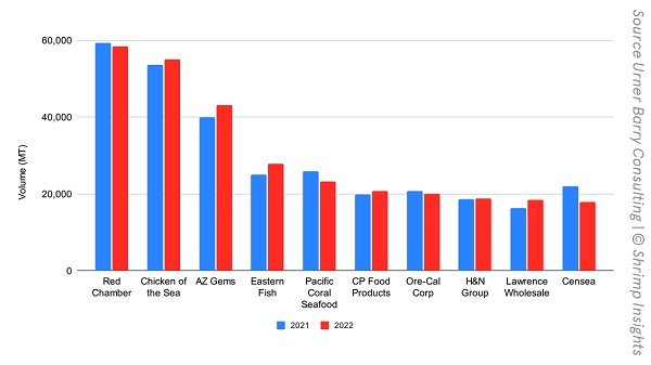 O blog Shrimp usou dados do banco de comércio exterior da Urner Barry para elaborar uma lista com os 10 maiores importadores de camarão dos EUA no período de 2021 e 2022. Veja a tabela a seguir: