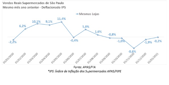 A pesquisa da Apas é sobre o faturamento real dos supermercados no estado de São Paulo (deflacionado pelo IPS/FIPE) no conceito de mesmas lojas – que considera as unidades em operação no tempo mínimo de 12 meses. A associação aponta uma queda de 0,2% em janeiro na comparação de 2021 contra 2020.